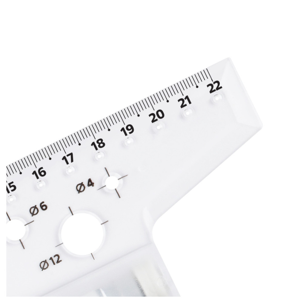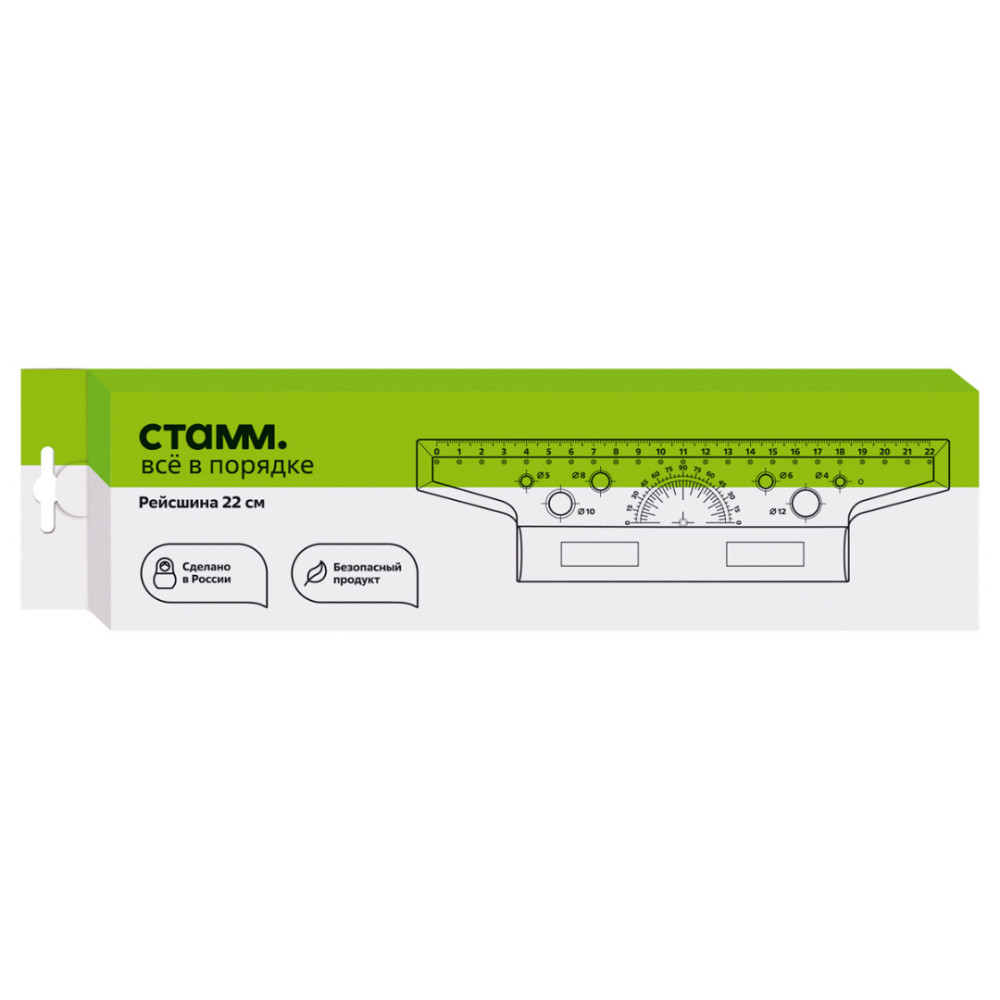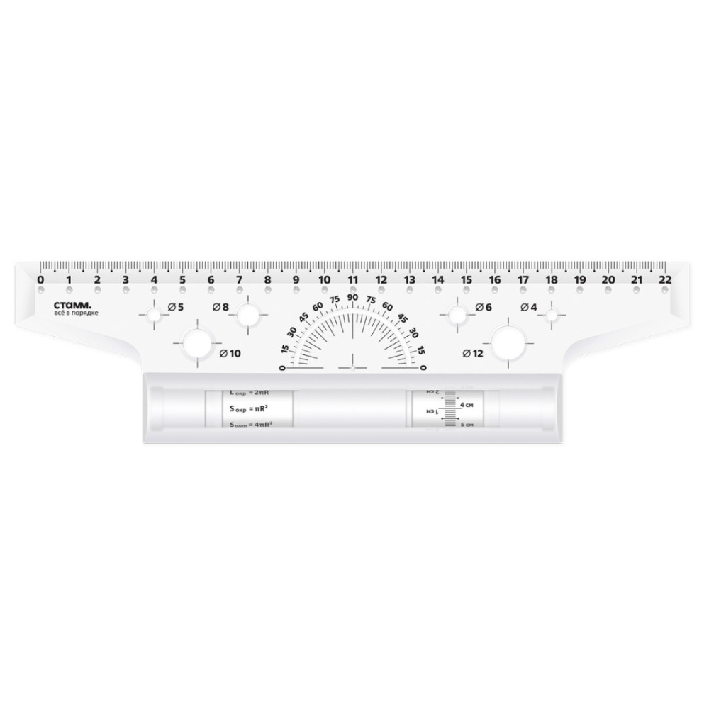Линейка рейсшина с металлическим роликом Стамм для выполнения чертёжных и измерительных работ. Линейка-рейсшина оборудована металлическим роликом, и идеально подходит для нанесения ровных параллельных линий. Длина шкалы – 22 см. Благодаря специальному покрытию ролика линейка не проскальзывает по бумаге. На изделии предусмотрен транспортир 180° и 6 трафаретов окружностей. Изготовлена из качественного полистирола. Рейсшина упакована в картонную коробку с европодвесом.