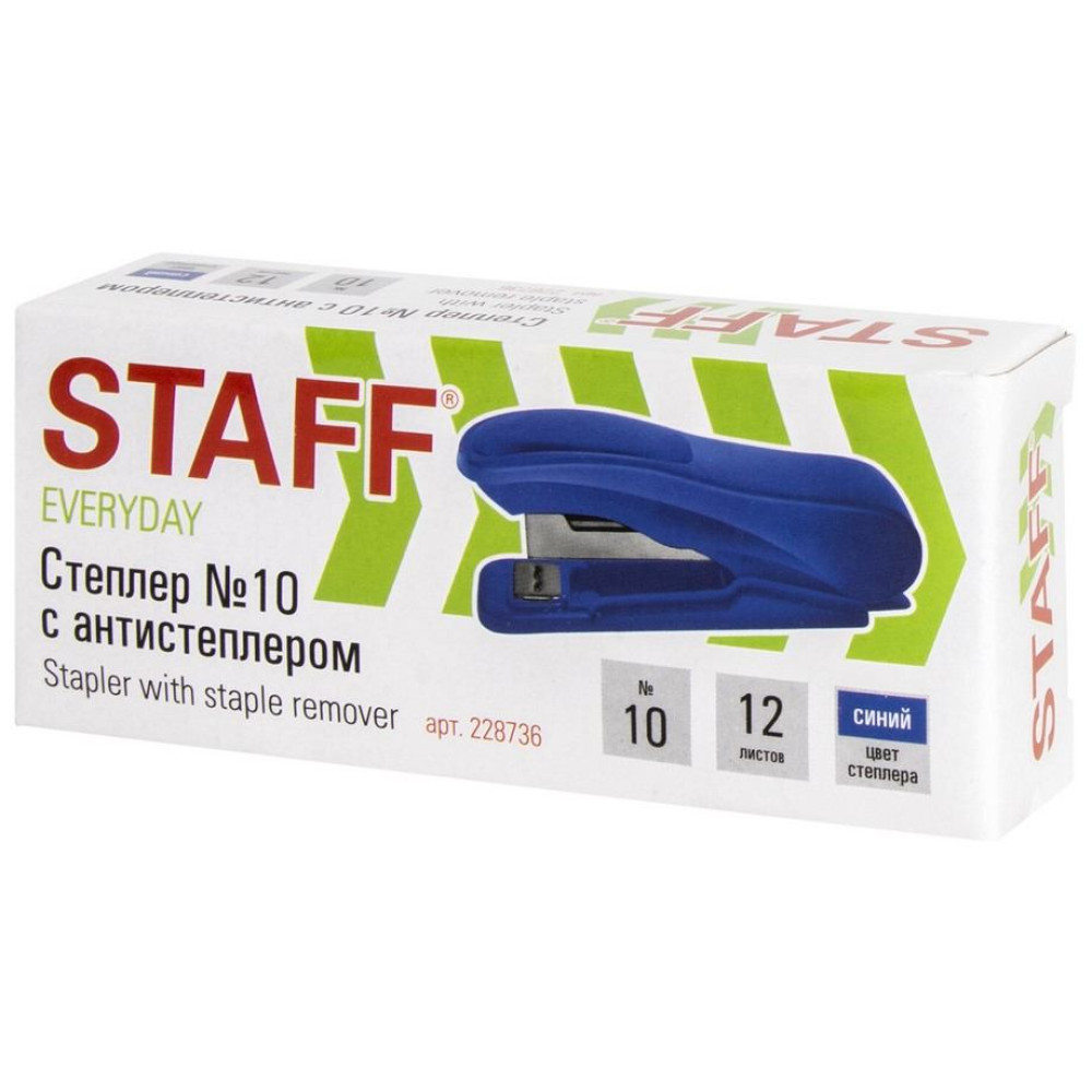 Степлер Staff "Everyday" №10 со встроенным антистеплером в синем эргономичном пластиковом корпусе с металлическим механизмом cпособен скрепить до 12 листов. Подходящий размер скоб № 10. Виды сшивания: закрытый. Глубина закладки бумаги - 43 мм. Габариты: высота - 40 мм, ширина - 29 мм, длина - 100 мм. Благодаря компактным размерам удобен в использовании и занимает мало места на рабочем столе, а классический дизайн делает степлер подходящим к любому интерьеру. Продается в картонной упаковке.