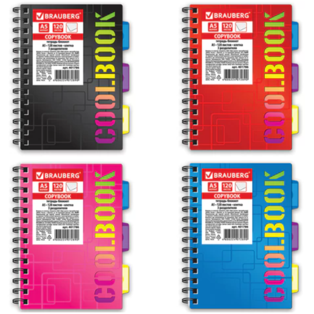 Тетрадь-блокнот BRAUBERG серии "CoolBOOK" предназначена для ведения записей среди старшеклассников, студентов и офисных сотрудников. Выполнена в ярком и неординарном дизайне. Обложка выполнена из цветного пластика с текстурой и сложной вырубкой. 3 удобных съемных разделителя помогут легко находить нужную информацию. Внутренний блок содержит 120 листов офсетной бумаги плотностью 65 г/м2 и белизной 100%. Линовка блока - в клетку. Листы соединены евроспиралью с левой стороны. Формат А5 (148х210 мм). Поставляется в 4-х вариантах цвета (без возможности выбора).