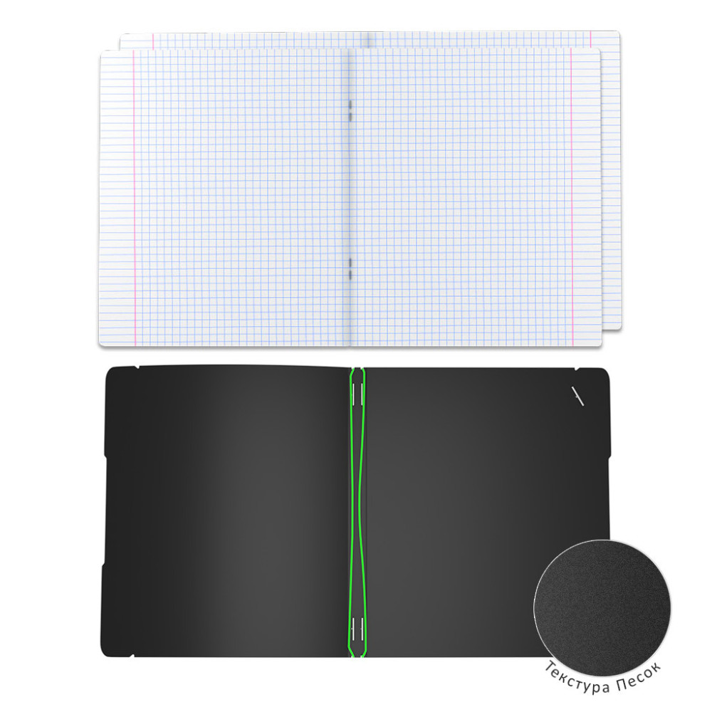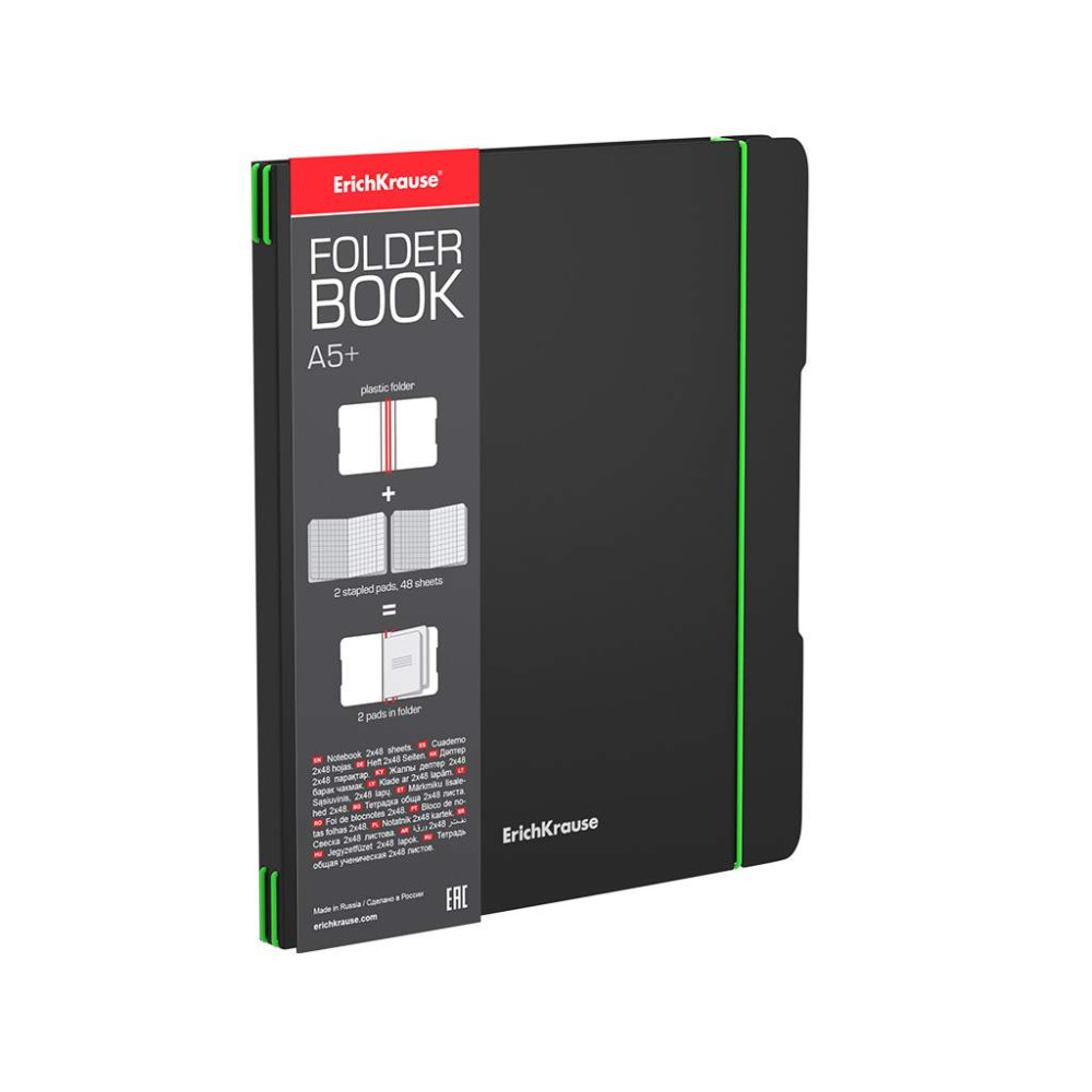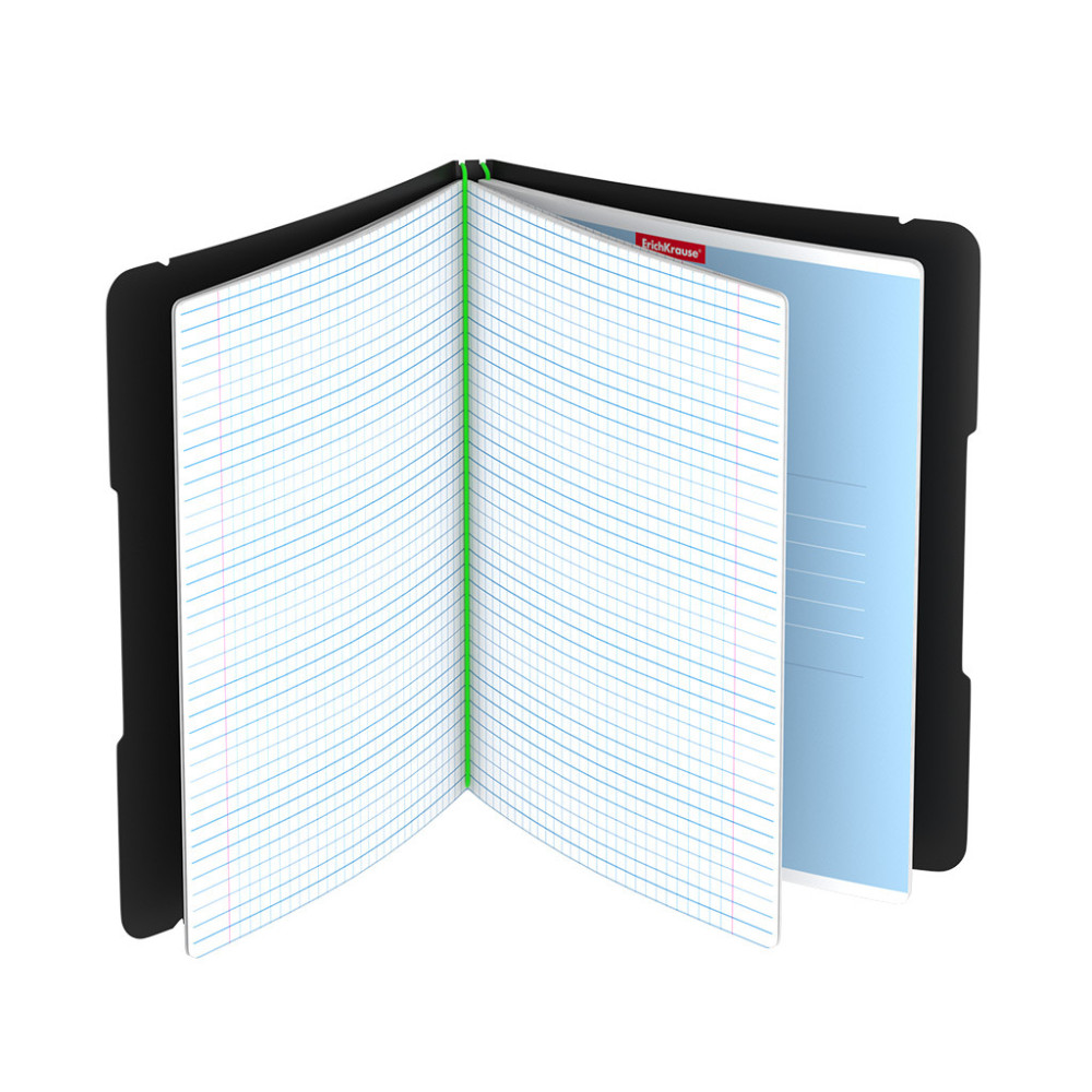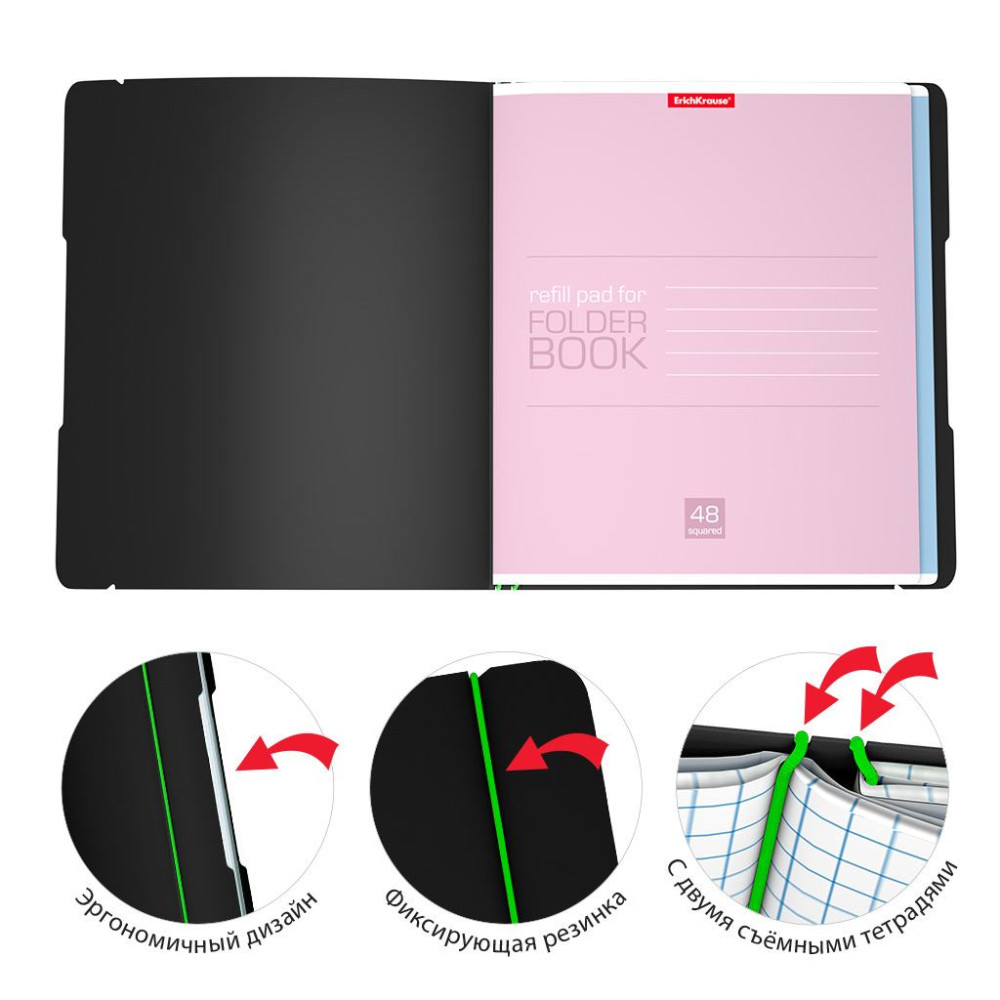 Тетрадь на резинке ErichKrause "FolderBook Accent". Тетрадь общая ученическая формата А5+ (170x203 мм) со сменными блоками FB Solution в пластиковой обложке. В комплект входят две тетради 48 листов на скобе в клетку с полями. Удобная система крепления на резинках дает возможность быстрой замены тетрадей, а фиксирующая резинка предотвращает нежелательное раскрытие. Эргономичный дизайн: специальные выемки на обложке облегчают перелистывание. Обложка из высококачественного износостойкого матового пластика с фактурой «песок». Бумага офсетная плотностью 60 г/м2. Цвет линовки — синий. Скругленные уголки обложки и блока.