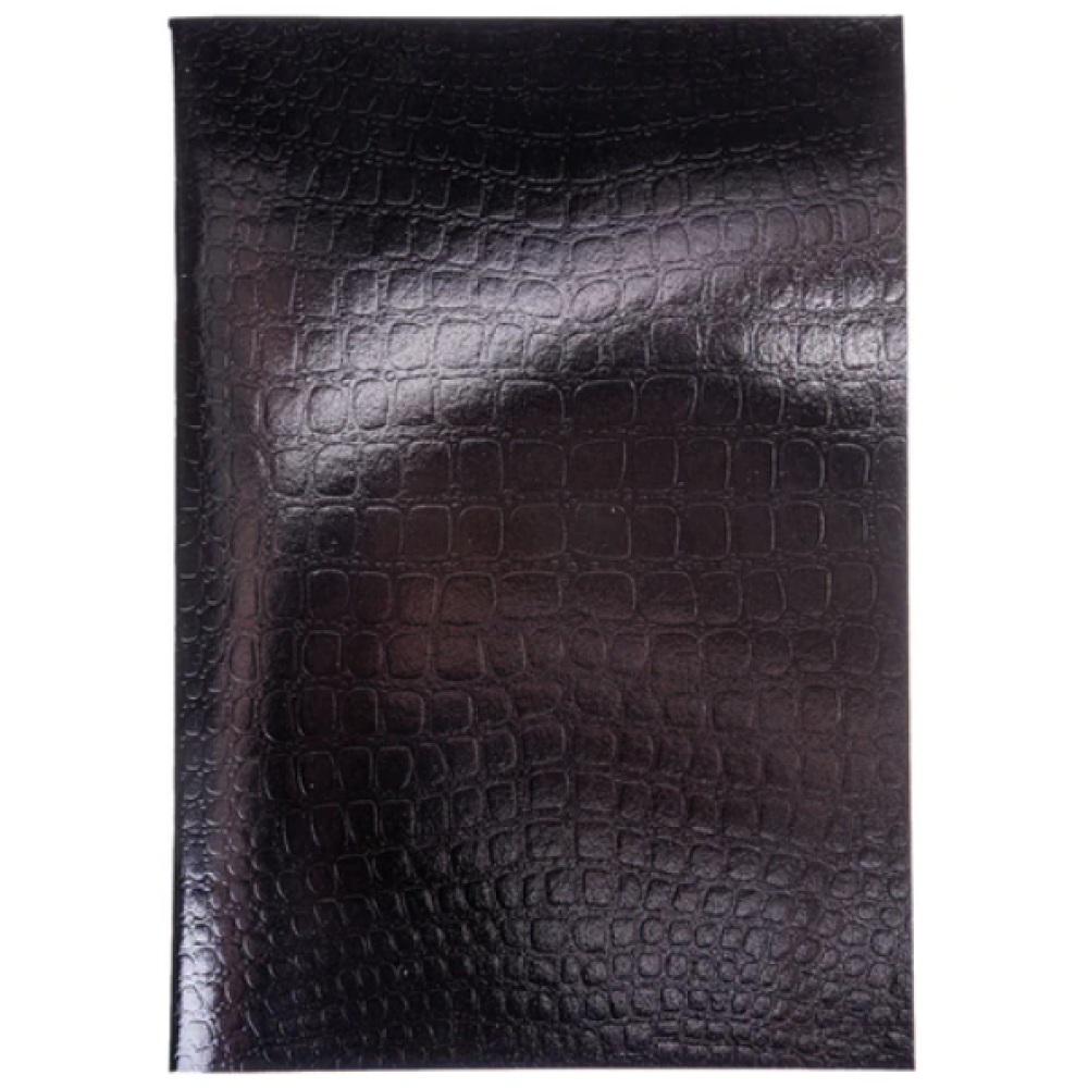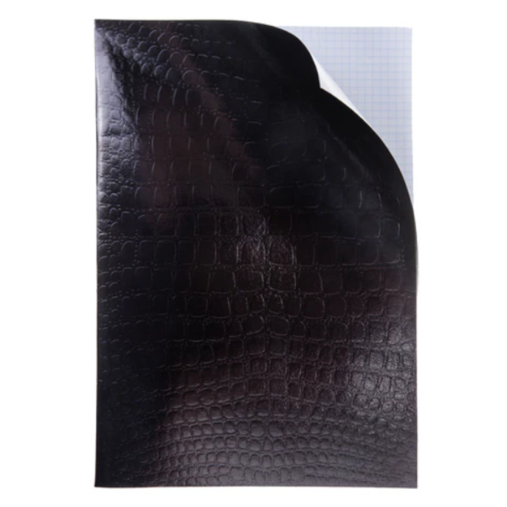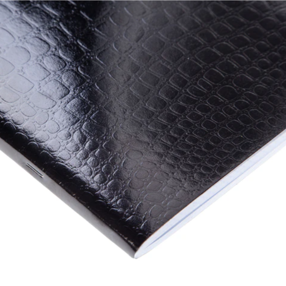 Тетрадь А4 формата, 96 листов. Материал обложки – бумвинил, "Metallic", чёрная, дополненная спецэффектами в виде тиснения CROCO. Внутренний блок – офсетная бумага 60 г/м2, клетка. Тип скрепления – скоба.