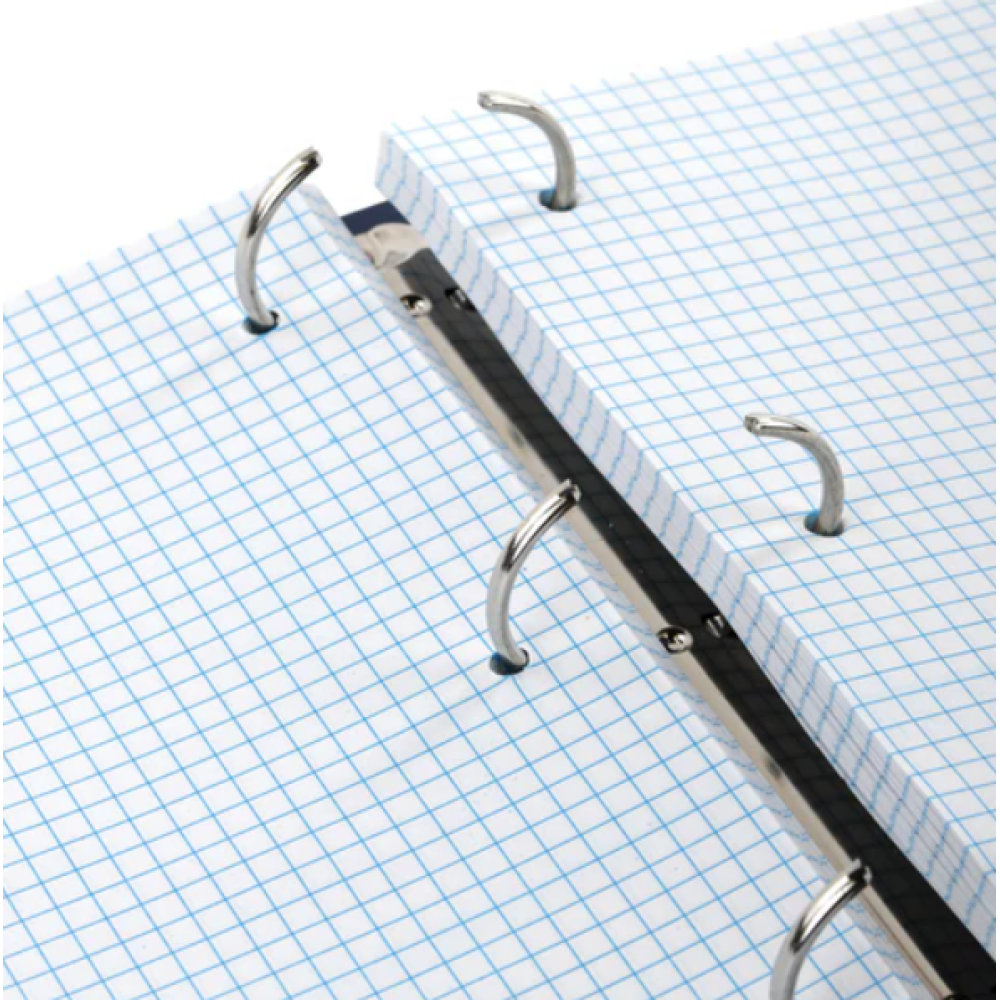 Блок состоит из 100 листов офсетной бумаги белого цвета плотностью 60 г/м2. Линовка - клетка. Жесткая книжная обложка выполнена из переплетного картона и покрыта глянцевой пленкой. Увеличенный формат А4 предназначен для ведения большего объема записей. Оборудована кольцевым механизмом с 4-мя кольцами для подшивки сменных блоков, что позволит носить на учебу/работу всего одну тетрадь с возможностью добавлять и менять листы. Диаметр колец составляет 25 мм.