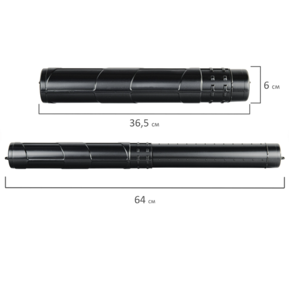 Телескопический (раздвижной) тубус STAFF с регулируемой длиной корпуса удобен для хранения и транспортировки чертежей и рисунков формата А1, А2, А3, А4. Тубус защитит чертежи и рисунки от внешних воздействий окружающей среды и случайных повреждений и заломов. Легкий, компактный, удобен в использовании для школьников младших и средних классов. Корпус тубуса раздвигается от 36,5 до 64 см. Диаметр: 6 см. Цвет: черный.