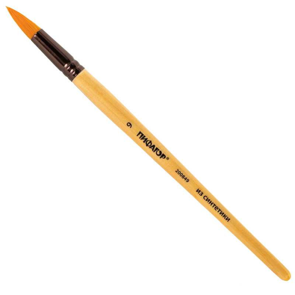 Кисть синтетическая Пифагор №9 подходит для работы с акварелью, гуашью, тушью, акрилом, а также для прорисовывания различных деталей рисунка. Снабжена защитным пластиковым колпачком. Кисть из синтетического ворса эластичная, не распадается, хорошо держит форму, долговечна и надежна. Кисть №9 позволит прорисовывать детали и наносить крупные мазки и линии. Деревянную лакированную рукоятку кисти удобно держать в руке.